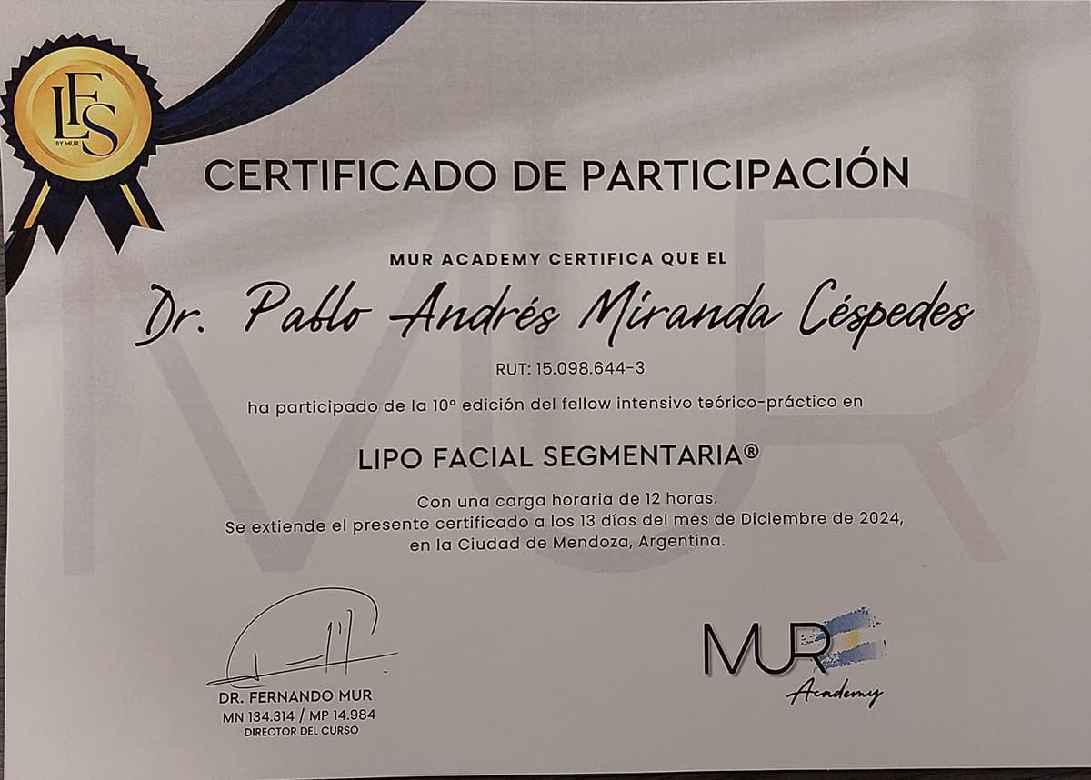 El doctor Pablo Miranda, otorrinolaringólogo y cirujano plástico facial, participó en la 10° edición Fellow intensivo teórico – práctico en Lipo Facial Segmentaria, Mur Academy.