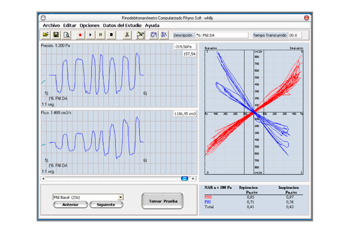 Se realiza tapando una fosa nasal y soplando por la otra para obtener una gráfica que describe y mide el flujo de aire que pasa por la fosa nasal estudiada.